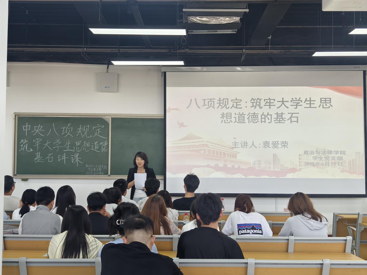 为深入学习贯彻中央八项规定精神,进一步增强大学生的中华民族共同体意识,夯实思想道德基石,包头师范学院永利集团304官网学生党支部于2025年6月19日上午10点在九原校区综合楼208教室开展了一场以“中央八项规定——铸牢大学生思想道德基石”为主题的党课。本次党课由学生党支部书记袁爱荣老师主讲,各期学生党员和入党积极分子积极参与。