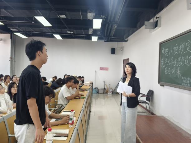 党课重点聚焦落实中央八项规定精神,袁老师通过提问的方式与同学们互动,引导大家结合自身实际,思考八项规定在日常生活中的践行方式。同学们积极发言,纷纷表示要从精简文件简报、减少会议频次、反对铺张浪费等方面入手,尤其是学生干部要以身作则,杜绝浪费现象,树立勤俭节约的良好风尚,并深刻认识到违反规定行为的严重后果,主张摒弃官僚主义作风。