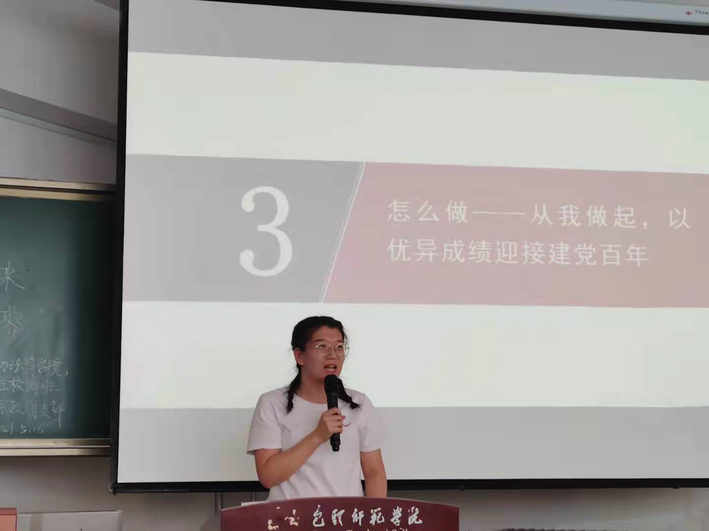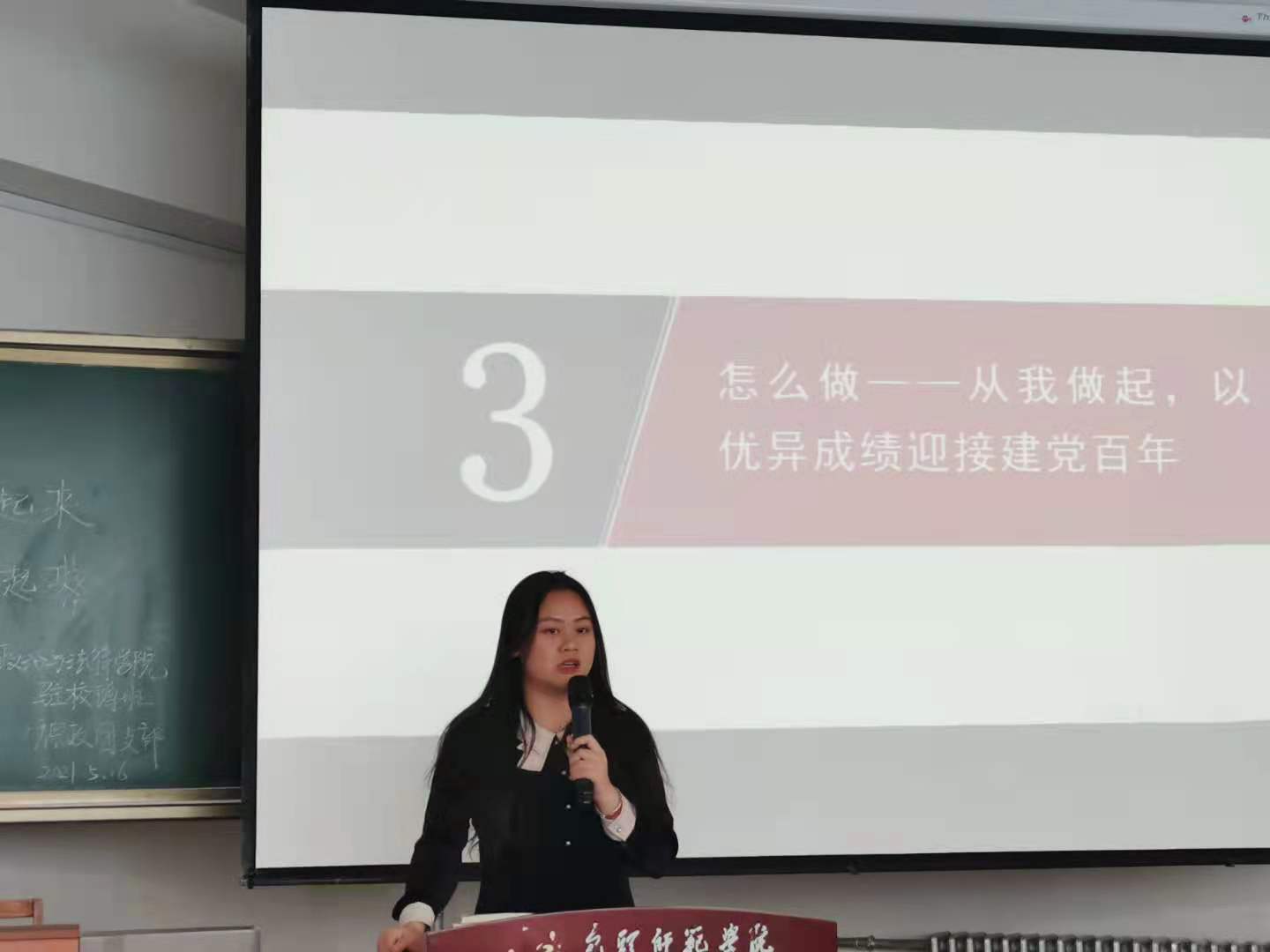 郭宏升老师对本次团日活动进行了总结。他对此次活动给予了充分肯定,认为活动有内容、有创新、有活力,同学们积极参与、密切配合,整个活动现场气氛热烈、高潮迭起,表现了新时代青年大学生对党史学习的渴望和积极响应。同时,郭宏升老师对活动内容进行了补充,他以“‘学起来,读起来,讲起来,做起来’——我学党史的一点体会”为题,从为什么学、学什么、怎么做三个方面分享了学习党史的体会,使同学们认识到了学习党史的重要意义,知道了学习的内容。他请朱贺、陈捍宁、谢丁杏梓发表“做起来”的表态发言,让她们传递了从我做起、英语过四六级、打扫好宿舍卫生、树立考研目标等承诺。同学们纷纷表示,将以优异成绩迎接建党100周年。