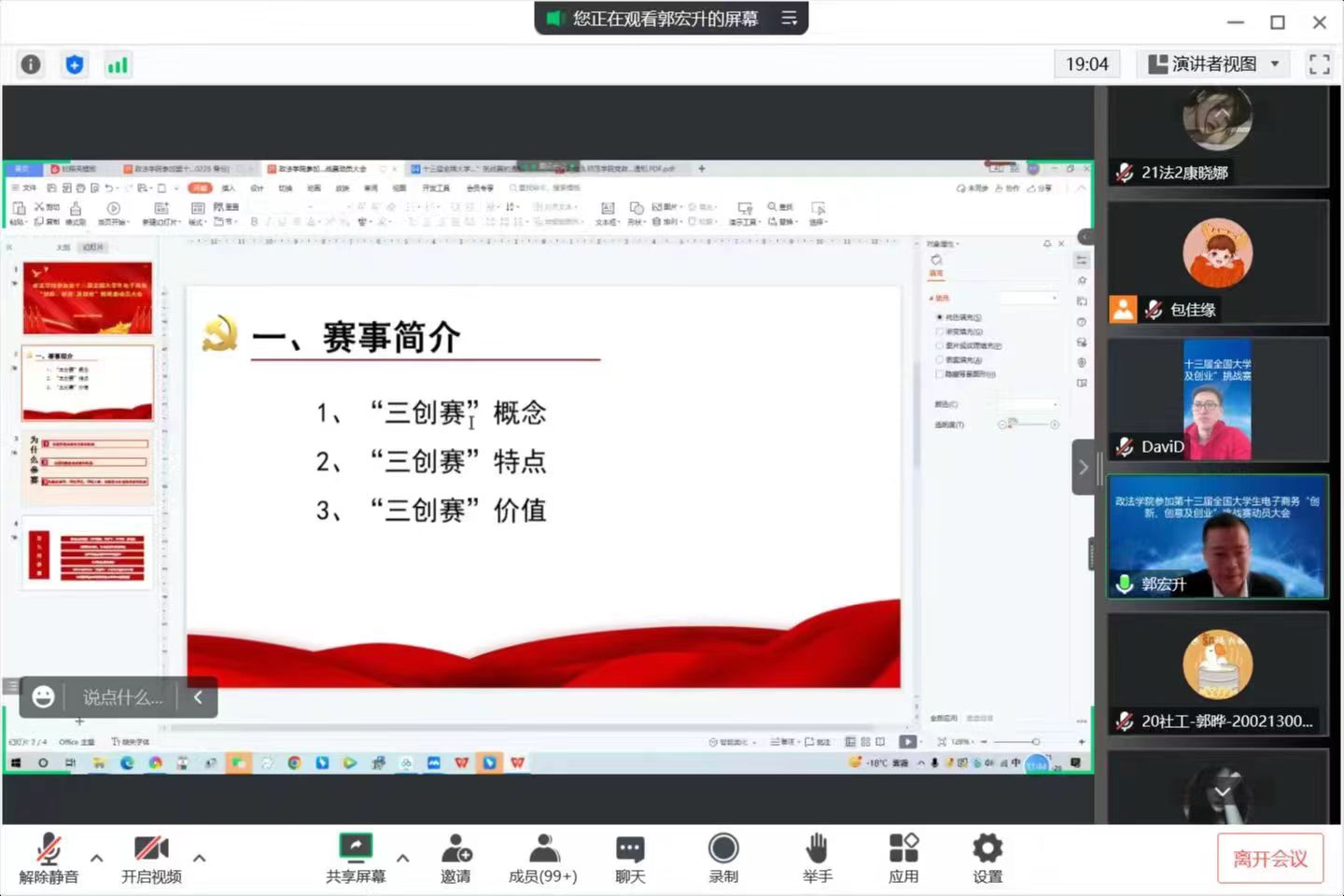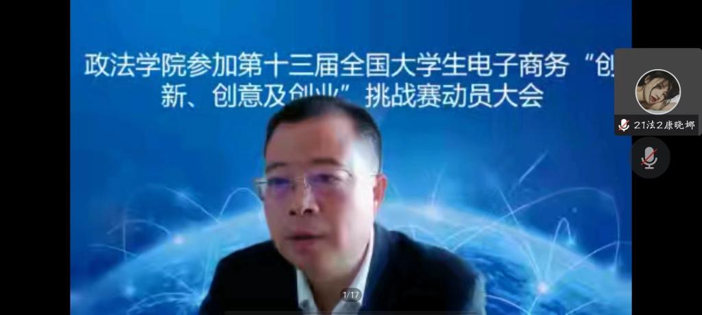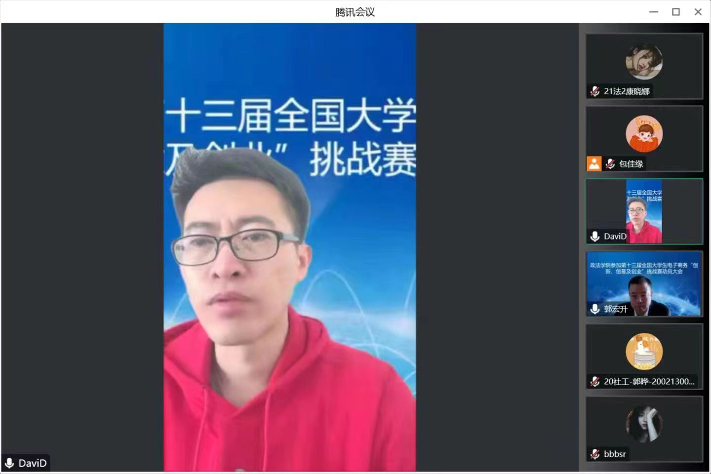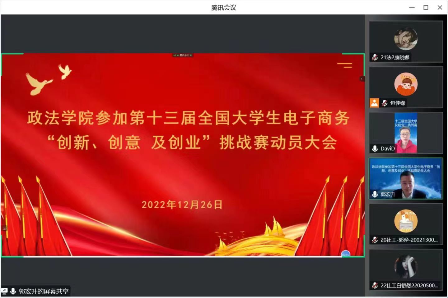 为迎接我校“第十三届大学生电子商务创新、创意及创业挑战赛”校赛省赛,多出高质量参赛项目,2022年12月26日上午,永利集团304官网在腾讯会议上召开了参加第十三届全国大学生电子商务“三创”挑战赛动员大会。学院党总支副书记郭宏升出席了会议,大一到大三各班班委会、团支部、宿舍长等近300人参加了会议。会议由辅导员赵鹏然老师主持。