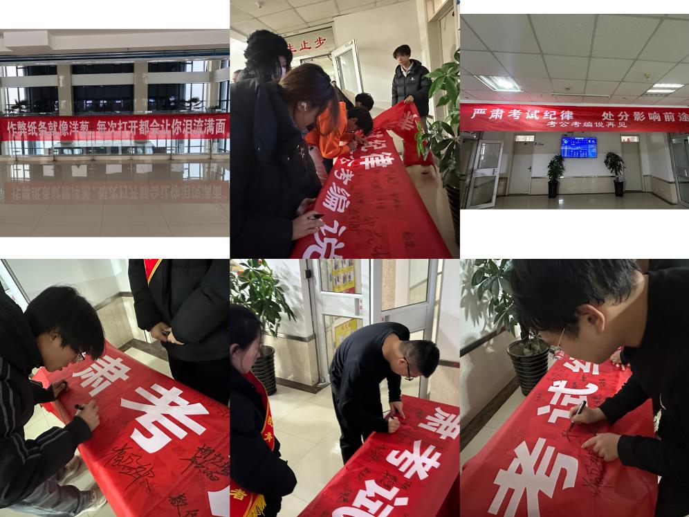 立足行动,有效承诺。学院制作了《严肃考试纪律,处分影响前途》、《作弊纸条就像洋葱,每次打开都会让你泪流满面》等诚信考试主题条幅,发起了“严肃考纪,诚信考试”横幅签名活动。同学们踊跃参与,郑重签名,庄严承诺:遵守考试纪律,严肃考风考纪。