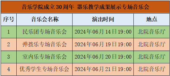 除6月21日当天的活动外,考生及家长还可以近距离感受包师艺术气息,观看音乐学院成立30周年器乐教学成果展示系列专场音乐会。具体时间安排如下: