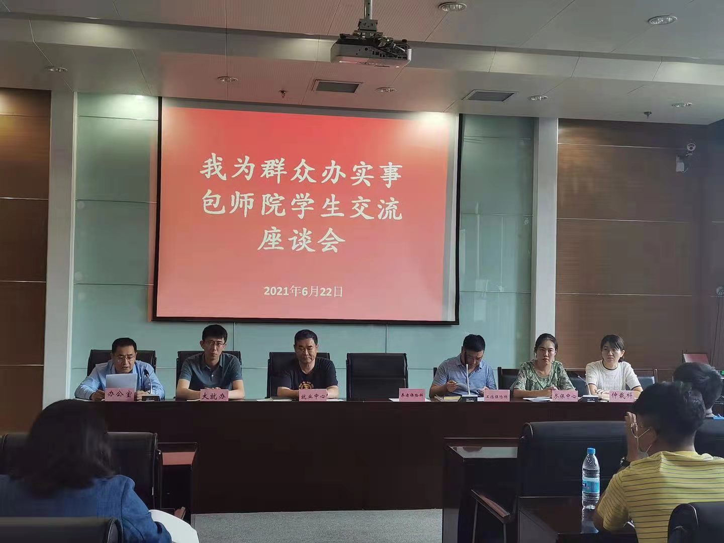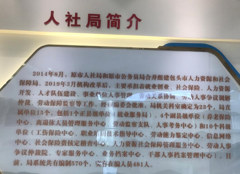 包头市人力资源与社会保障局位于包头市九原区建设路与建华南路交叉口南1.2公里处,内设办公室、综合科、政务服务科(行政审批)、就业促进与失业保险科、劳动关系科等二十一个科室,有一个完善健全的社会保障体系。上午九点钟,在包头市人力资源与社会保障局办公大楼三楼2号会议室举行了一场深入的学习交流座谈会,由人社局办公室郭勇主任主持,大学生就业办、就业中心、工作保险科、参保中心、仲裁科等各重要部门负责人参与。