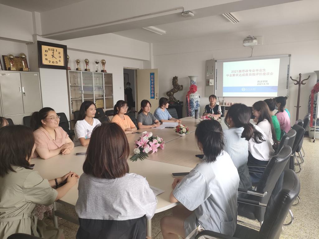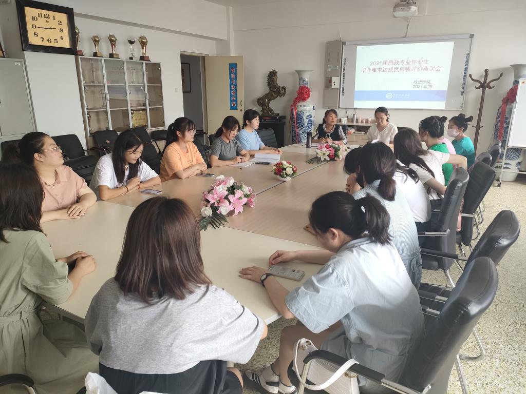 为推进思想政治教育专业认证工作,我院于2021年6月16日下午在博学楼729会议室召开2021届毕业生毕业要求达成度自我评价座谈会,政法学院副院长李霞、思政系主任李娜出席会议。李霞副院长阐述了座谈会主旨和重要意义,希望同学们围绕毕业要求指标点进行自我评价,并提出自己的意见和建议。