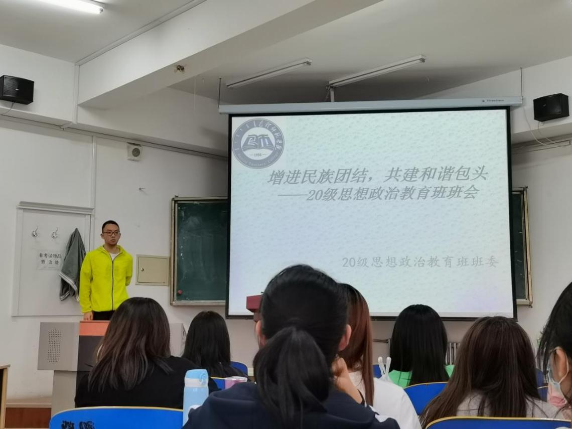 此次班会由“学习一个典型模范,讲述一个故事,学唱一首歌曲,学习民族政策”等环节组成。各班班委带领同学们学习了民族政策,增强了各少数民族同学和汉族同学之间的情谊,增进了少数民族同学的归属感。各班还进行了学唱一首歌活动,在此环节中,各班同学在班委的带领下合唱民族歌曲,在每位同学嘹亮动听的歌声中,深刻的感受到了中华民族就应该像石榴籽一样紧紧抱在一起,民族团结一家亲的思想更加深入人心。同时各班同学还进行了民族团结故事分享,进行宣誓承诺等环节,通过宣誓承诺,使各班同学深刻的认识到了民族团结是社会和谐稳定、国家长治久安的重要保证。