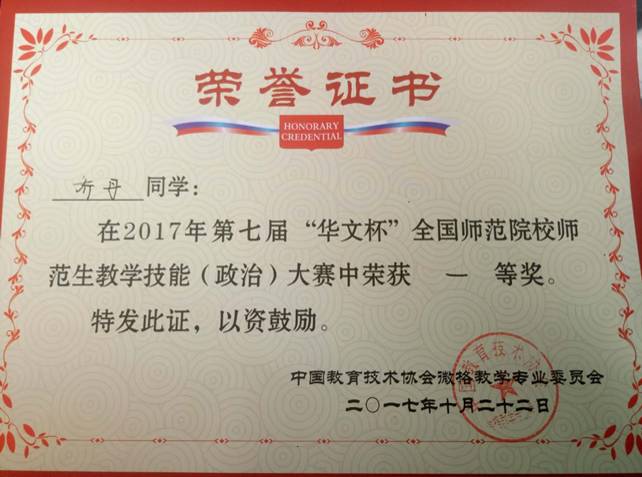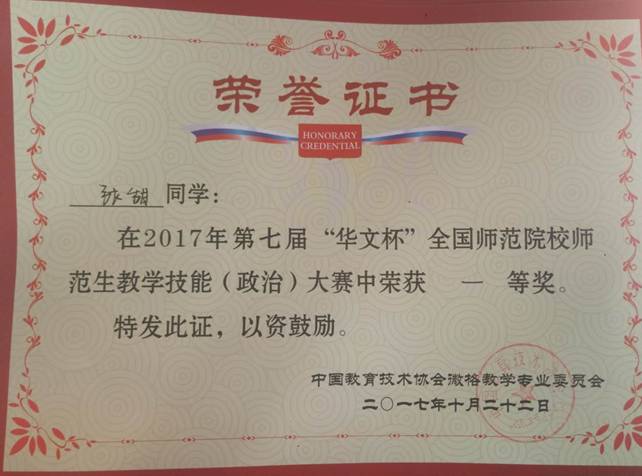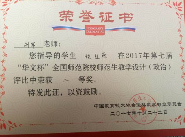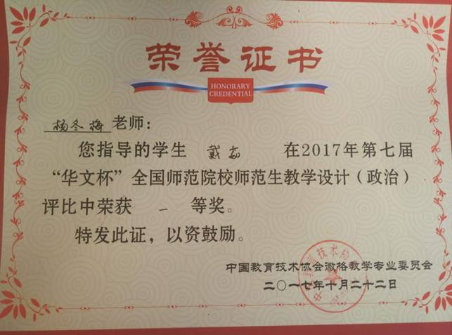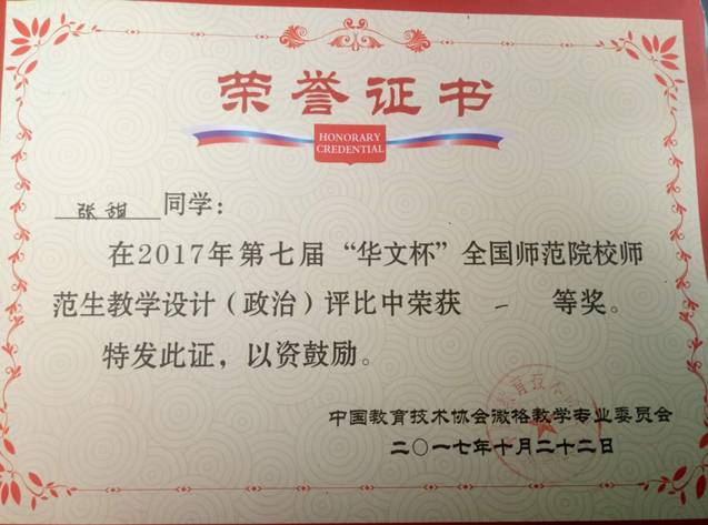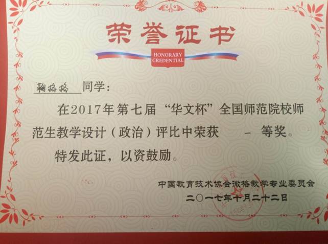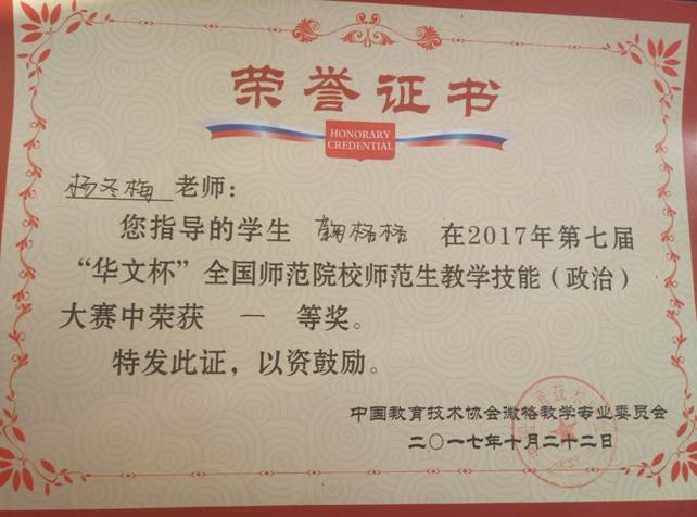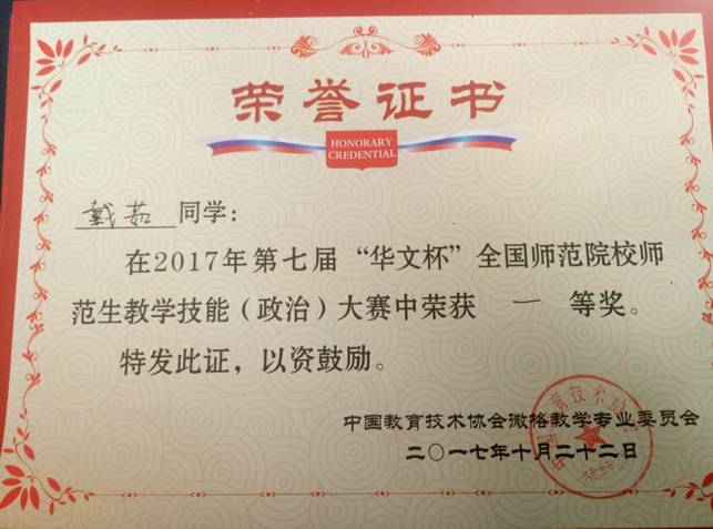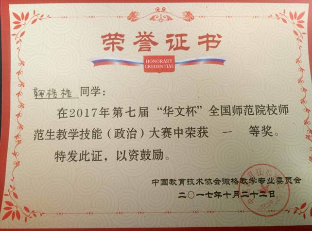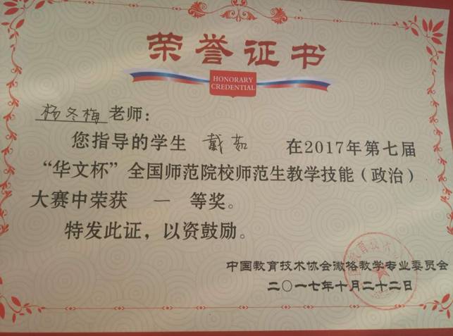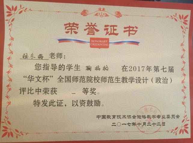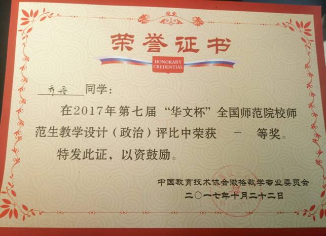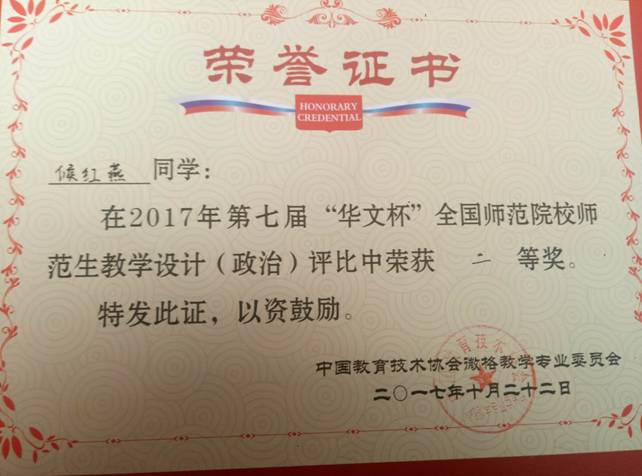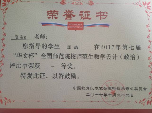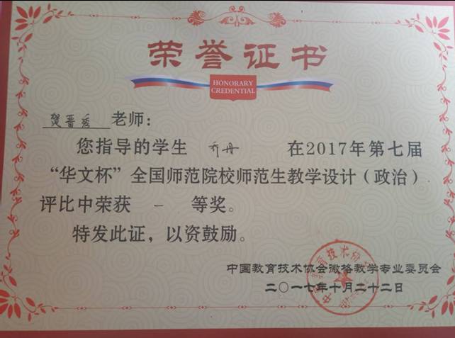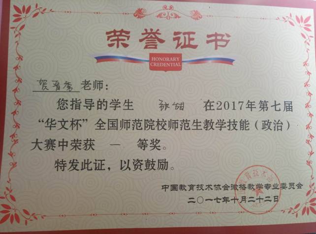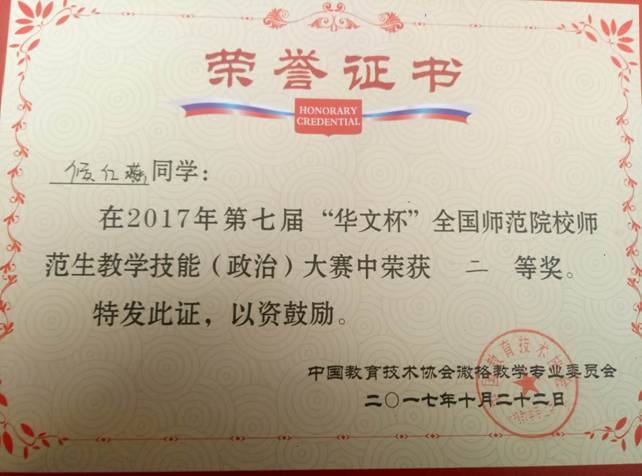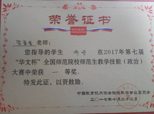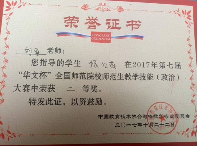 2017年10月21-22日,由中国教育技术协会微格教学专业委员会主办的第七届“华文杯”全国师范院校师范生教学技能大赛在山西师范大学举行。永利集团304官网思想政治教育系选派5名优秀学生代表,由贺晋秀、杨冬梅、刘军老师带队参加了此次比赛且再获佳绩,其中四名学生在教学技能比赛及教学设计评选中荣获一等奖,一名学生荣获二等奖,展示了我校思政专业学生良好的教师教育技能和风采,同时也拓宽了参赛师生的视野。为了备战此次比赛,学院组织有丰富教学经验的老师组成指导团队,备赛期间,宋从越老师、刘军老师、以及杨冬梅贺晋秀等多位老师对参赛同学进行全面系统的指导和训练;参赛学生在比赛的准备过程中,十分珍惜教师职业技能训练学习与交流的宝贵机会,虚心听取指导老师们的意见,刻苦训练,不断改进、力求精益求精。