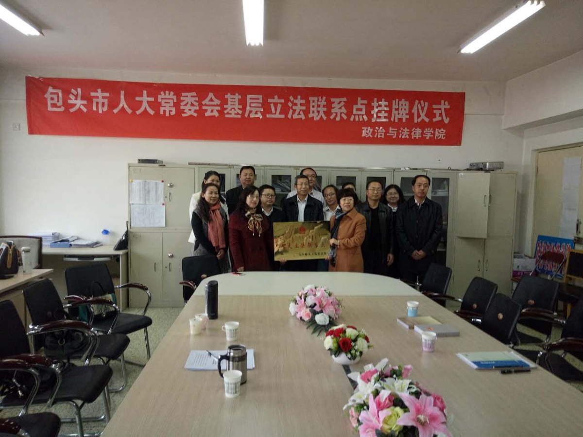2015年11月10日下午,包头市人大常委会基层立法联系点揭牌仪式在包头师范学院永利集团304官网会议室举行。包头市人大法制委员会副主任王子林一行3人、包头师范学院永利集团304官网院长李凤斌、副书记副院长米长存、副院长宋从越参加揭牌仪式,李凤斌院长主持会议。