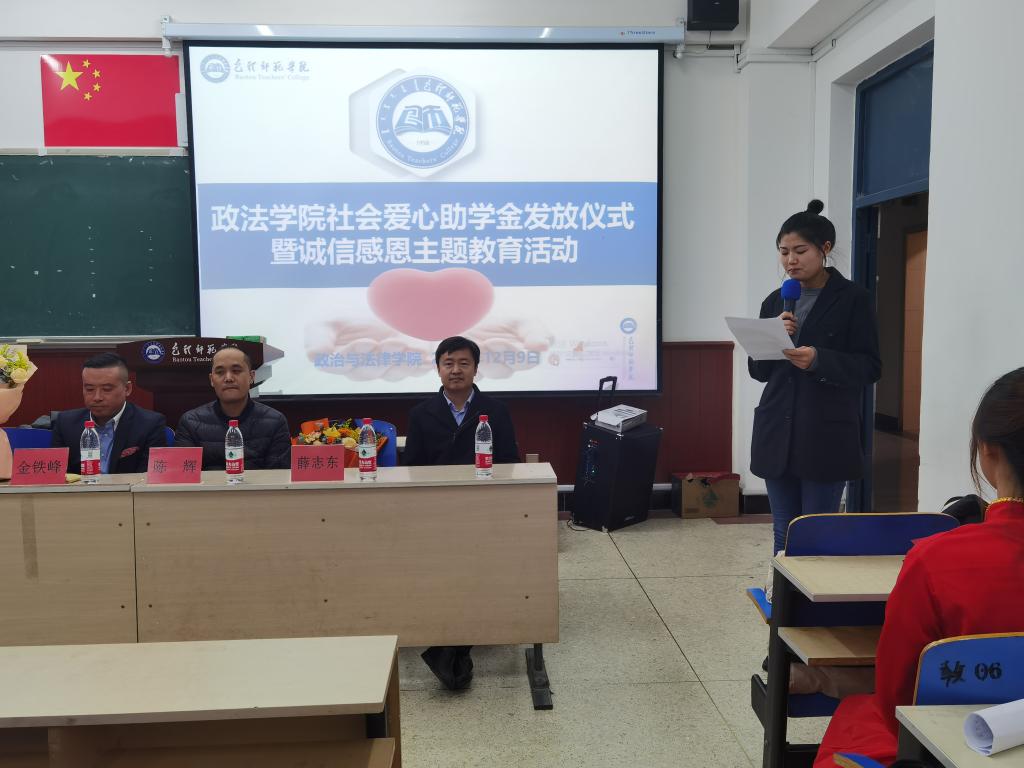 为践行“我为师生办实事”承诺,帮助家庭经济困难学生减轻负担、更好地完成学业,激励他们努力学习、自立自强、不断提升自身素质,2021年12月9日晚上,政法学院在博学楼西505室举办了社会爱心助学金发放仪式暨诚信感恩主题教育活动。社会爱心人士金铁峰、陈辉两位先生、学生工作部部长薛志东、政法学院工会主席秦嗣权出席了发放仪式,获得资助学生、部分学生代表90多人参加了此次活动。仪式由政法学院党总支副书记郭宏升主持。
