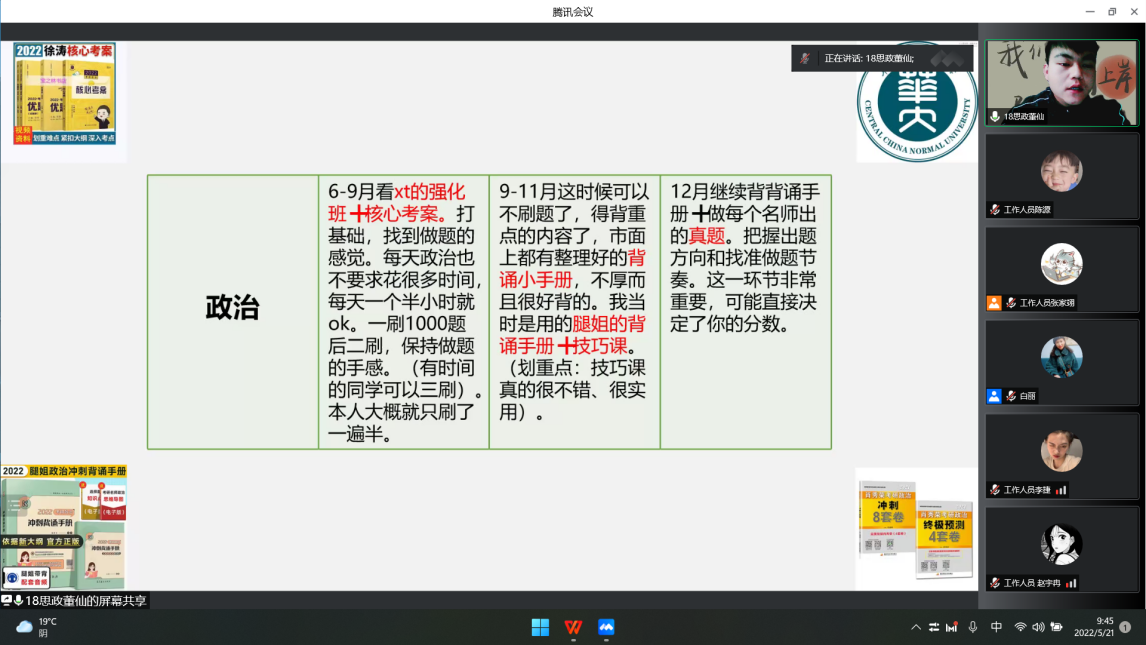 近年来,越来越多的大学生选择了考研这条道路,但是许多准备考研的同学对于考研的事项或多或少还有疑惑,如何去面对考研?怎样去准备考研?为了让学生对考研有更充分的认识,明确本专业的就业方向和发展前景,进而更好地了解考研趋势、备考考研, 5月20日至5月21日,永利集团304官网举办了两场考研经验交流讲座。此次讲座分别邀请了18级法学、社会工作、政治学与行政学和思想政治教育四个专业成功上岸的14名同学,采取线上直播的方式进行了考研经验交流。讲座由辅导员白丽主持,政法学院全体同学参与。各年级同学报名热情高涨,参与活动积极踊跃,并认真听取考研经验,展现出我院浓厚的学习氛围和学习态度。