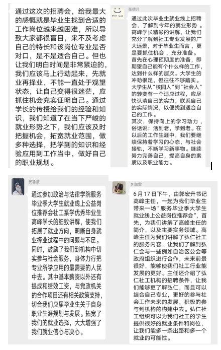 本次活动,为政法学院毕业生提供了就业岗位,拓宽了就业渠道。参会的同学对弘仁社工机构的各项信息和⽂化理念有了⼀定的了解,纷纷表示会及时把握机会,拓宽就业范围,做出多种选择,把学到的知识和经验应用到工作中,做好自己的职业生涯规划。