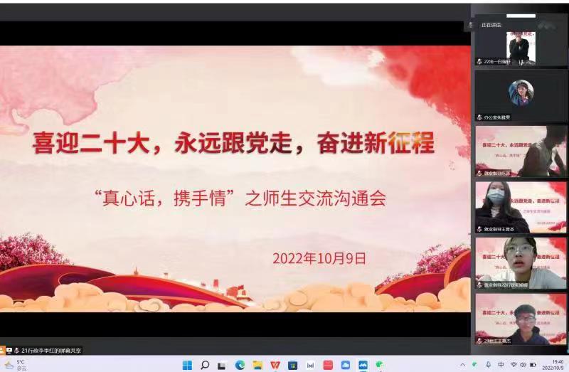 为了迎接中国共产党第二十次全国代表大会胜利召开,营造良好的校园疫情防控环境,增进疫情期间同学们的沟通交流,2022年10月5日-2022年10月10日,永利集团304官网学生干部以及2019-2022级15个班级分别举办了线上交流会,各班班主任老师及全体同学参与了此次交流会。
