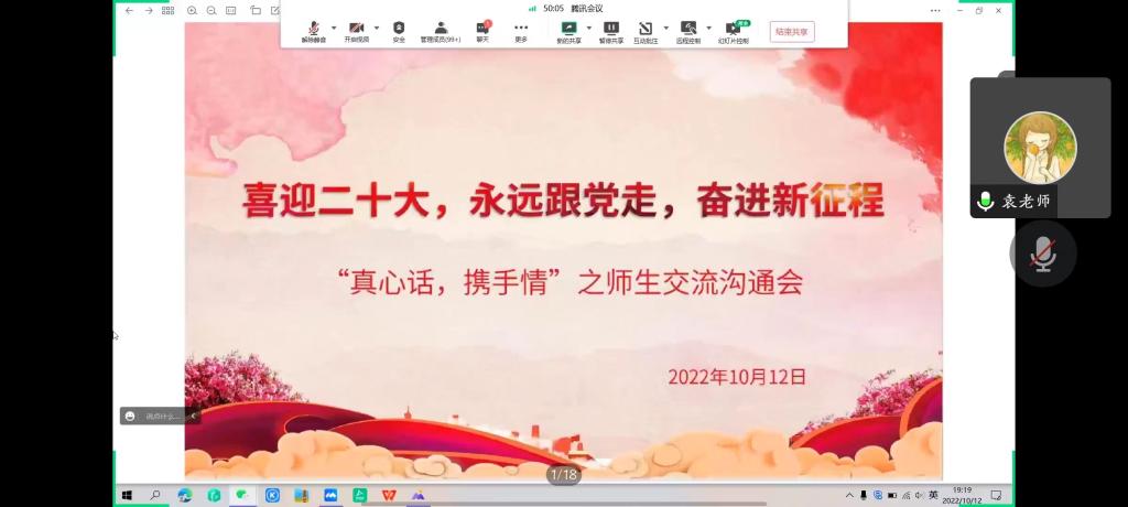 为了迎接中国共产党第二十次全国代表大会胜利召开,做好学校疫情防控工作,响应学校号召,展开四级团务工作,永利集团304官网于2022年10月12日在腾讯会议线上展开了第二次“真心话,携手情”之师生交流沟通会,团总支书记、学工办主任袁爱荣老师、各班团支书、班长以及团小组组长参加了本次会议。