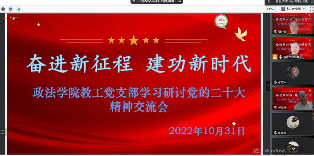 2022年10月31日,政法学院教工党支部进行了以“奋进新征程,建功新时代”为主题的学习宣传贯彻党的二十大精神专题研讨会,全体教工党员参加了研讨会。