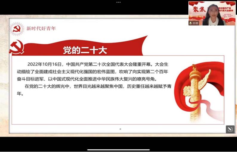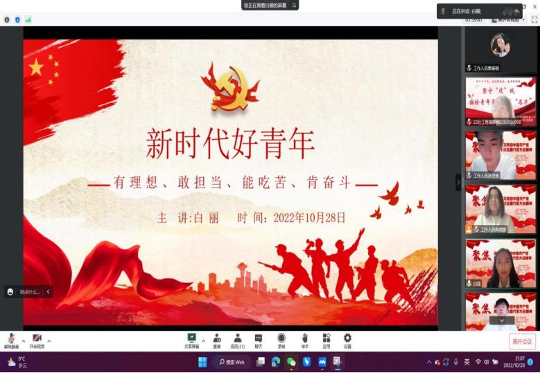 为深入学习贯彻党的二十大精神,引领广大青年坚定永远跟党走的信念,讴歌时代主旋律,传承红色基因,2022年10月28日,政法学院学生党支部围绕党的二十大精神,以“争做有理想、敢担当、能吃苦、肯奋斗的新时代好青年”为主题的线上专题研讨会。政法学院学生第一党支部书记袁爱荣、学生第二党支部书记白丽、学生党支部全体党员、积极分子和班级代表参加了研讨会。