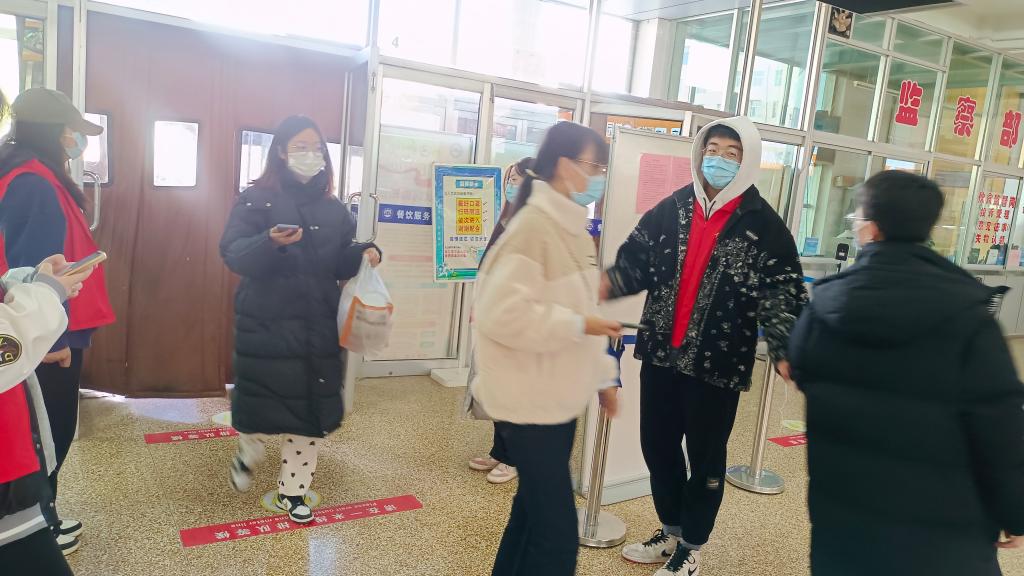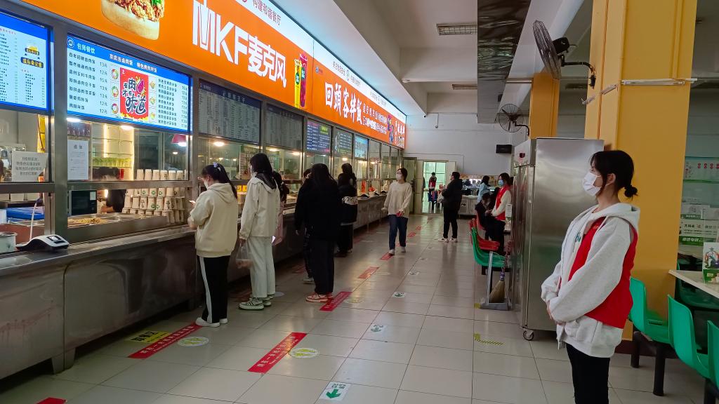 进入餐饮中心前,志愿者们在门口仔细检查同学们的扫码情况并确保每位进入餐厅的同学都佩戴口罩。进入餐饮中心内部,每个取餐口附近都有一名志愿者引导同学们保持一米的距离有序排队取餐。