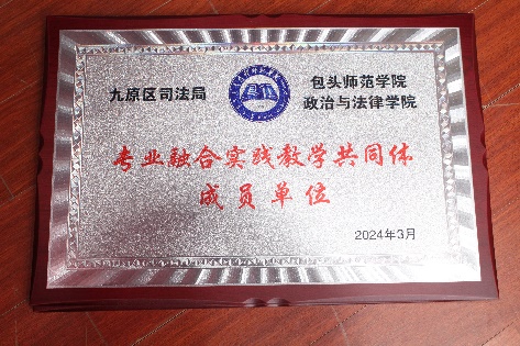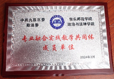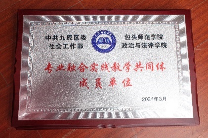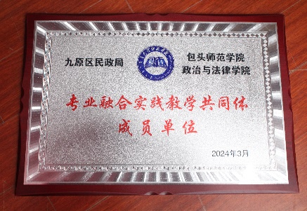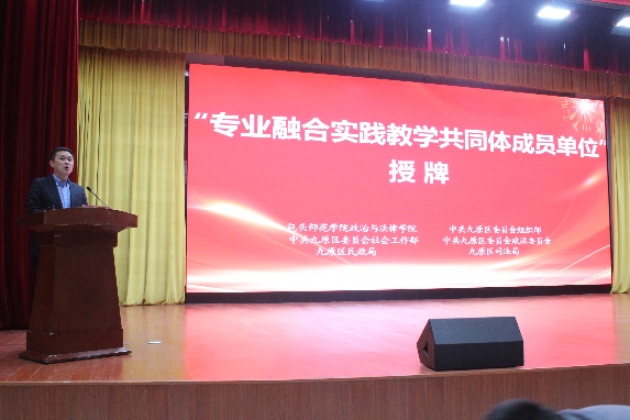 会议第二项议程,包头师范学院永利集团304官网为中共九原区委组织部、社会工作部、政法委、九原区民政局、司法局授“专业融合实践教学共同体成员单位”牌匾。包头师范学院永利集团304官网与九原区委区政府各部门推进的政校合作,是在永利集团304官网“法学、社会工作、政治与行政学”专业融合发展基础上推进的。专业融合实践教学共同体的建立是永利集团304官网深入贯彻落实新时代高等教育改革发展的重要举措。这一举措将为我校永利集团304官网的教师提供学以致用、施展才干、服务地方经济社会发展的平台;将为永利集团304官网三个专业的679名学生提供参与法律援助、法律宣传、社区治理、社会调查、政策研究、行政管理等实践活动的优质通道,为学生了解法律实务、提升社会工作能力,增强政治素养和行政能力带来可行路径。