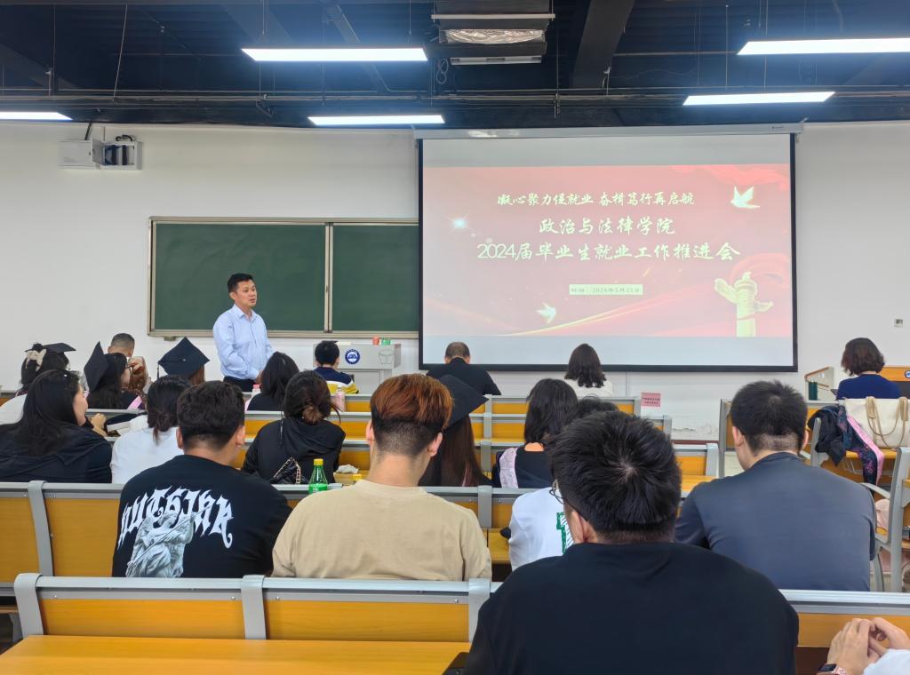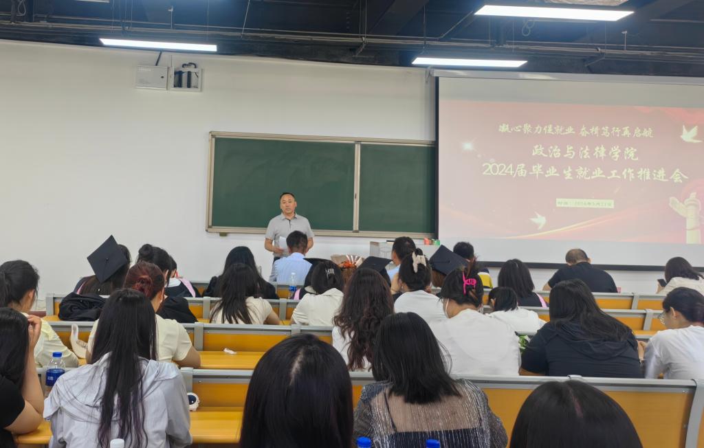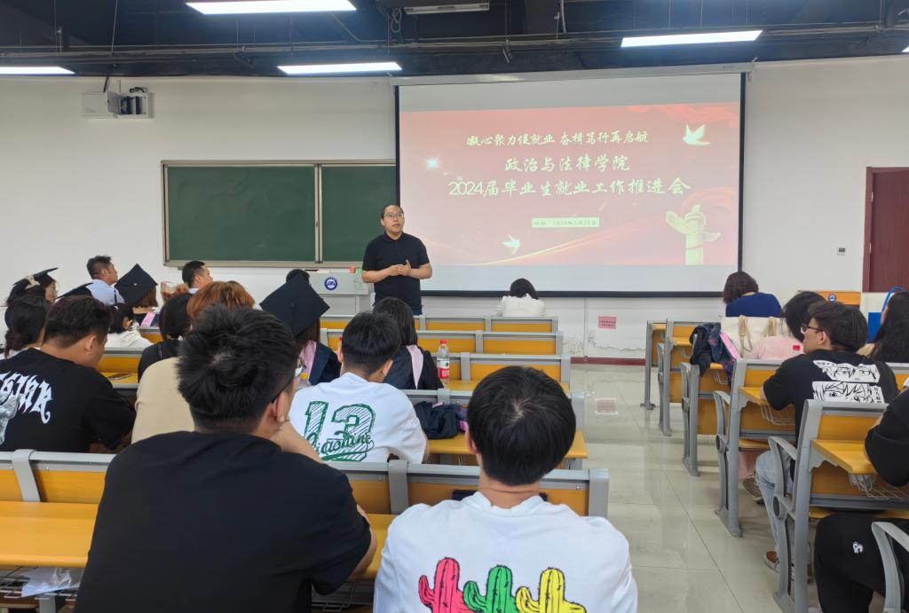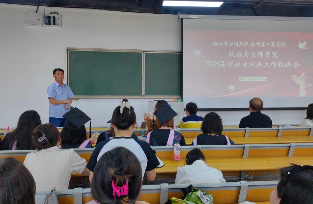 为持续推进毕业生就业工作,助力2024届毕业生就业冲刺,永利集团304官网于5月21日在九原校区综合楼208教室召开2024届毕生第四次就业工作推进会,学校招生就业处副处长秦嗣权、政法学院党总支书记孙傲飚、院长高德胜、副院长魏成、学工办主任袁爱荣、就业工作辅导员、毕业班班主任和全体2024届毕业生参加了会议。会议由党总支书记孙傲飚主持。
