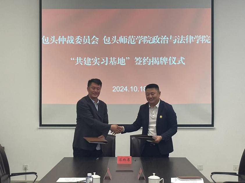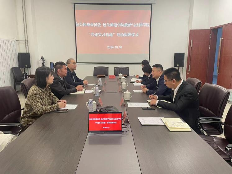 2024年10月18日上午,包头师范学院政治法律学院赴包头仲裁委员会举行实习基地挂牌仪式,将包头仲裁委员会作为法学专业实践教育基地。包头师范学院永利集团304官网院长高德胜、副院长魏成及法律系教师、包头仲裁委员会副主任、秘书处秘书长刘瑞杰及相关工作人员参加了签约揭牌仪式。