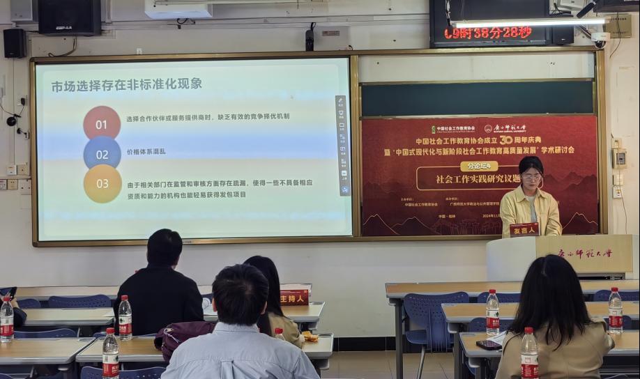会议期间师生们聆听各位专家的报告,并积极参与讨论和交流,教师代表郭艳作为理事成员单位代表参与了第七届理事会工作第二次会议,学生代表王研方、赵佳乐、薛丽雅分别在在“社会工作实践研究”“健康社会工作”“社会工作其他议题”分论坛进行了主题汇报,充分展示了学院社会工作专业的研究成果。