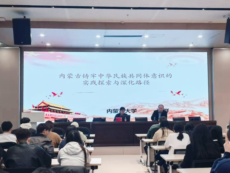 张群教授从铸牢中华民族共同体意识提出的社会层面、学术层面、国际层面三维背景开启讲授,为同学们梳理了中央民族工作会议精神。与同学们分享了“三千孤儿入内蒙、齐心协力建包钢”等感人至深的历史事件,让同学们对模范自治区有了更加深入的认识与感悟,对内蒙古铸牢中华民族共同体意识的实践探索有了更为深入的了解,激发了同学们对铸牢中华民族共同体意识的深刻思考。讲座最后,张群教授提出了提升依法治理民族实务现代化、构筑中华民族共有精神家园、夯实中华民族共同体的物质基础、促进民族交往交流交融和保障各民族共创共享美好生活的深化路径。张教授从社会学视角为学生呈现了该主题的时代价值、历史价值,并勉励同学在铸牢中华民族共同体意识的践行之路上砥砺前行。