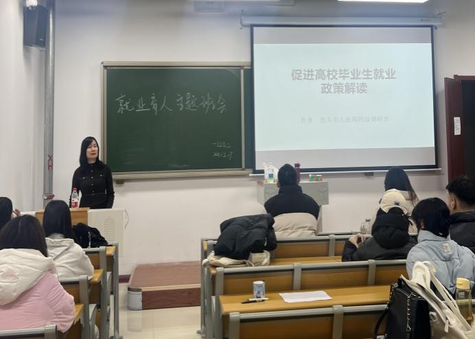在各班级互动环节中,同学们围绕《包头市高校毕业生就业政策解读》文件内容,分组讨论了自己的求职方向与困惑,各小组代表踊跃发言,提出了诸如“就业还是创业”、“专业对口的重要性”“如何平衡薪资与发展空间”等问题。在答疑解惑环节,面对同学们关于就业创业选择、职业转型的纠结,老师们结合案例与个人经验,条分缕析给出建议,鼓励大家做好职业规划,拓宽职业视野、挖掘自身潜能。