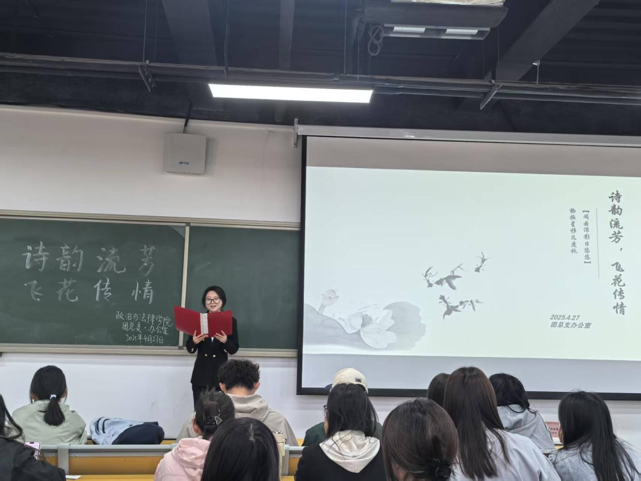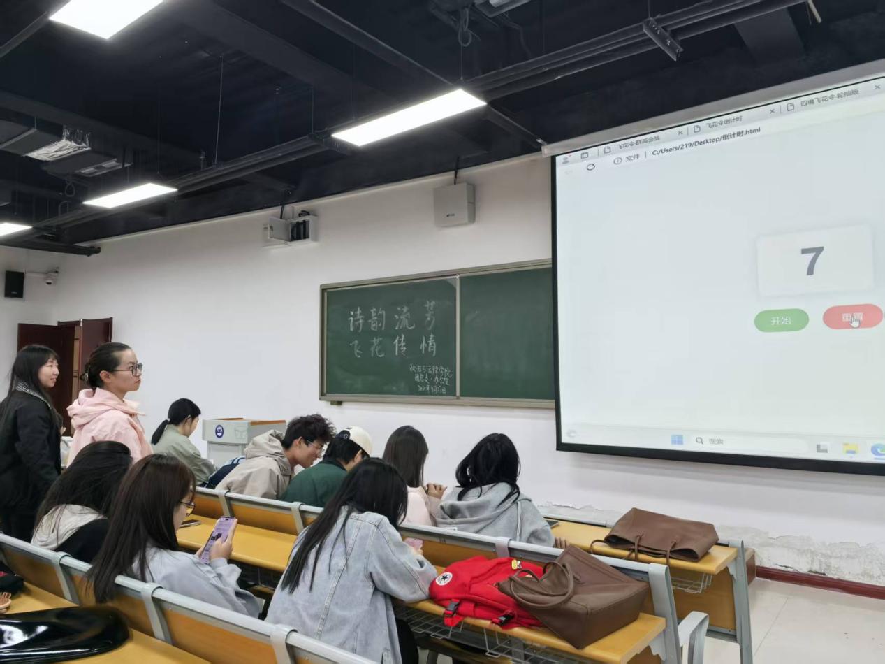 为了激发学生对古典诗词的兴趣,提升文学素养,促进传统文化在校园的传承与创新,2025年4月27日晚七时,永利集团304官网在九原校区综合楼208教室举办了“诗韵流芳,飞花传情”活动。永利集团304官网部分学生参与了此次活动。