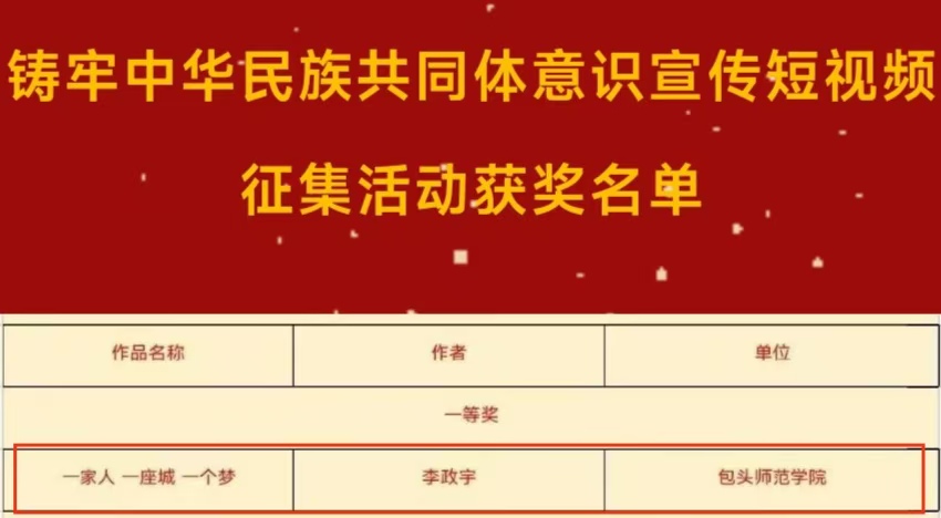 2025年5月16日,由包头市委办公室、市委宣传部、市委统战部、市民委联合主办的“共绘民族团结长卷 同谱鹿城发展新篇”铸牢中华民族共同体意识宣传作品征集活动评审结果揭晓。政法学院政治学与行政学专业学生李政宇创作的短视频作品《一家人 一座城 一个梦》从全市各界投稿的作品中脱颖而出,荣获短视频类一等奖。