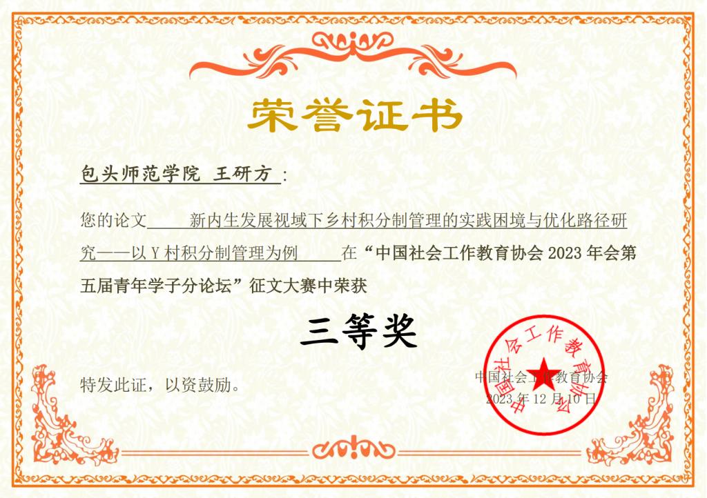 中国社会工作教育协会2023年会暨“中国式现代化新阶段社会工作与社会治理现代化”学术研讨会在河南师范大学成功举办。2023年12月8日-10日永利集团304官网社会工作系系主任贾少敏带领23级社会工作研究生王研方同学参加了中国社会工作教育协会年会,该生撰写的《新内生发展视角下乡村积分制管理的实践困境与优化路径选择》入围第五届青年学子论坛。2024年3月获悉该生荣获中国社会工作教育协会第五届青年学子论坛征文大赛三等奖。