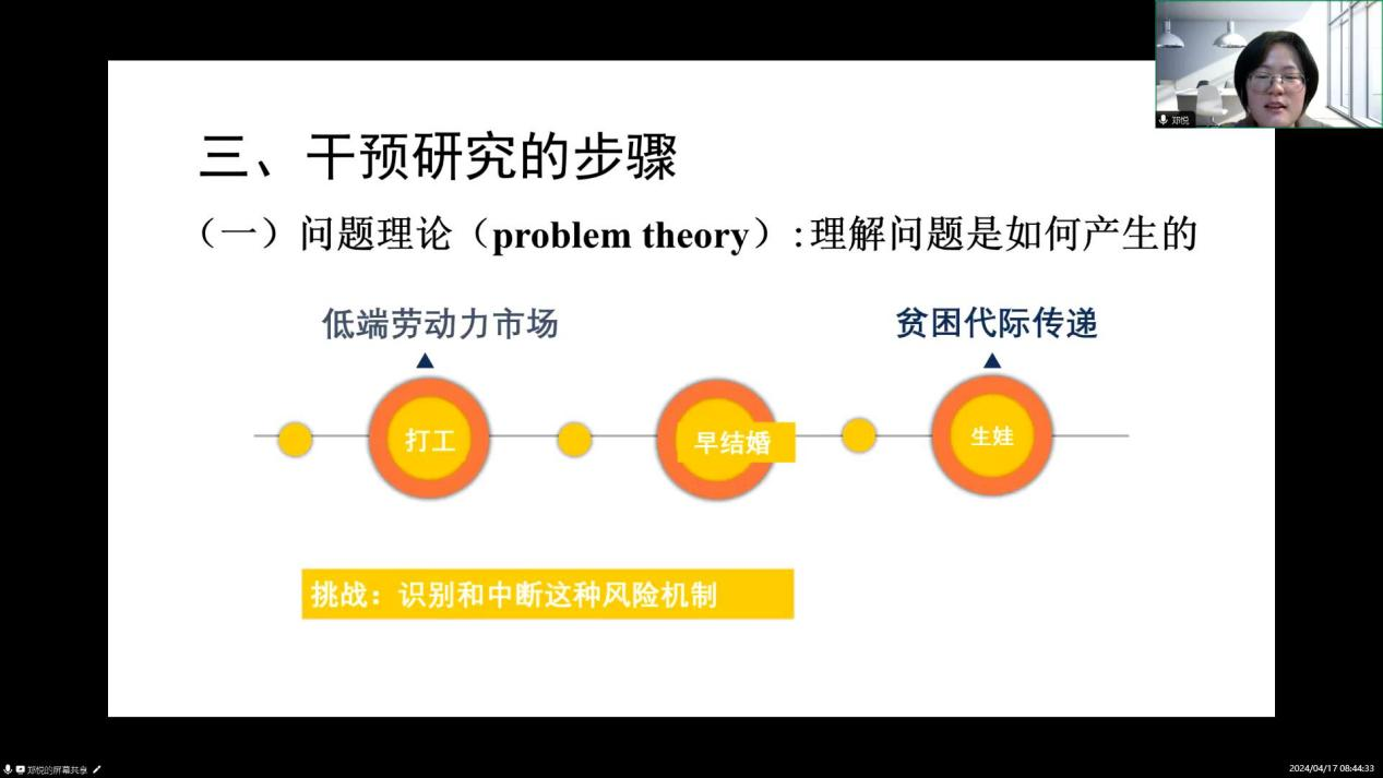 讲座伊始,张燕副教授对特邀嘉宾郑悦老师做了介绍并表示,希望通过本次讲座可以帮助同学们强化对于干预研究的认识、明晰在个案、小组干预过程中的问题路径和干预选择,同时拓展学习视野、吸取经验、完善自身实践经验。讲座开始,郑老师先向在座同学提出了一个问题:我们平时接触到的个案干预或小组干预的过程是如何进行的?对于该问题的回答作为本次讲座的主旨要素。郑老师从干预研究的解释、问题理论与干预路径图、项目理论与变化理论、干预手册四个方面完整的讲述了社会工作干预的框架体系设计和干预策略的选择。最后郑老师与同学们分享了自己在设计干预手册过程中的设计思路和注意事项,同学们依据本次讲座学习到的内容和引发的思考与郑老师进行了互动交流。